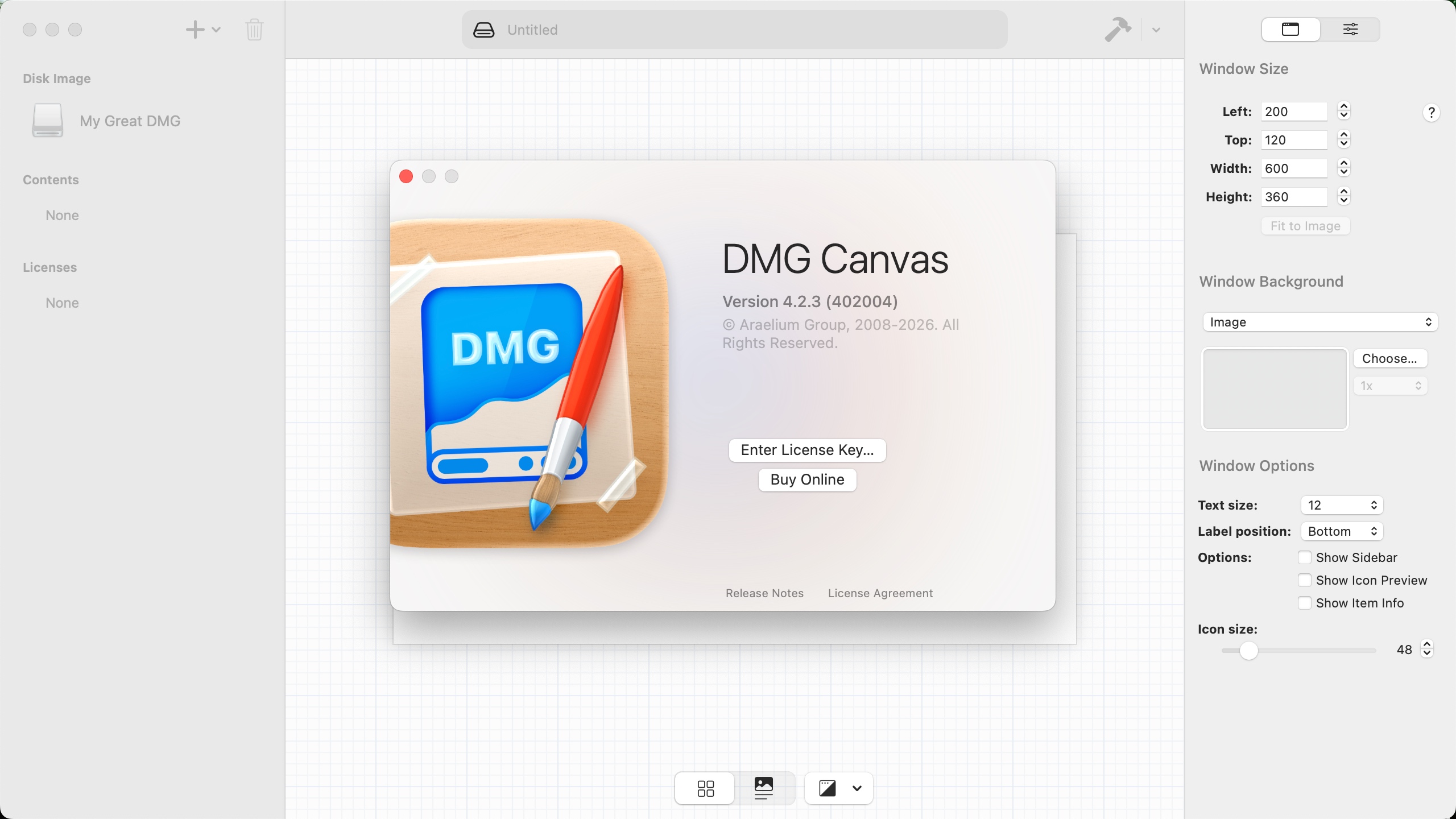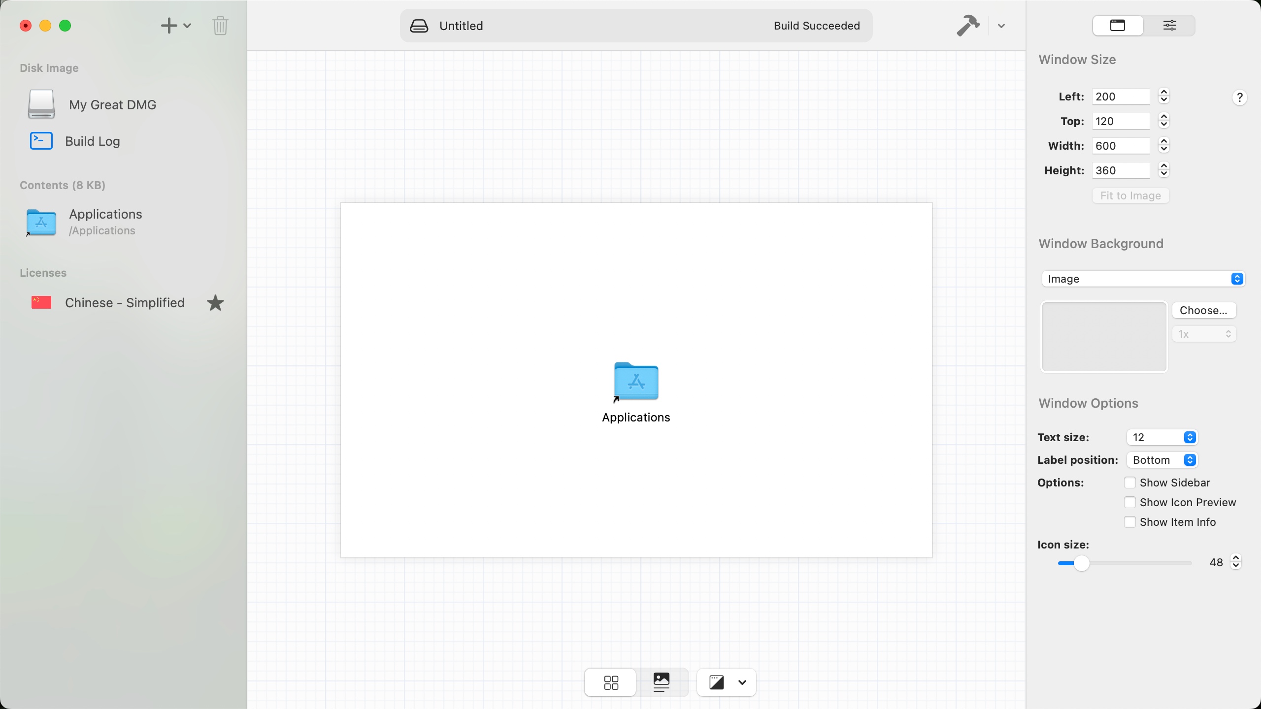 制作磁盘镜像不应该很难。使用DMG画布,只需将您的磁盘映像呈现一个背景图像,将文件拖放到窗口视图上,然后单击构建。你在DMG画布中看到的是它在Finder中的外观。